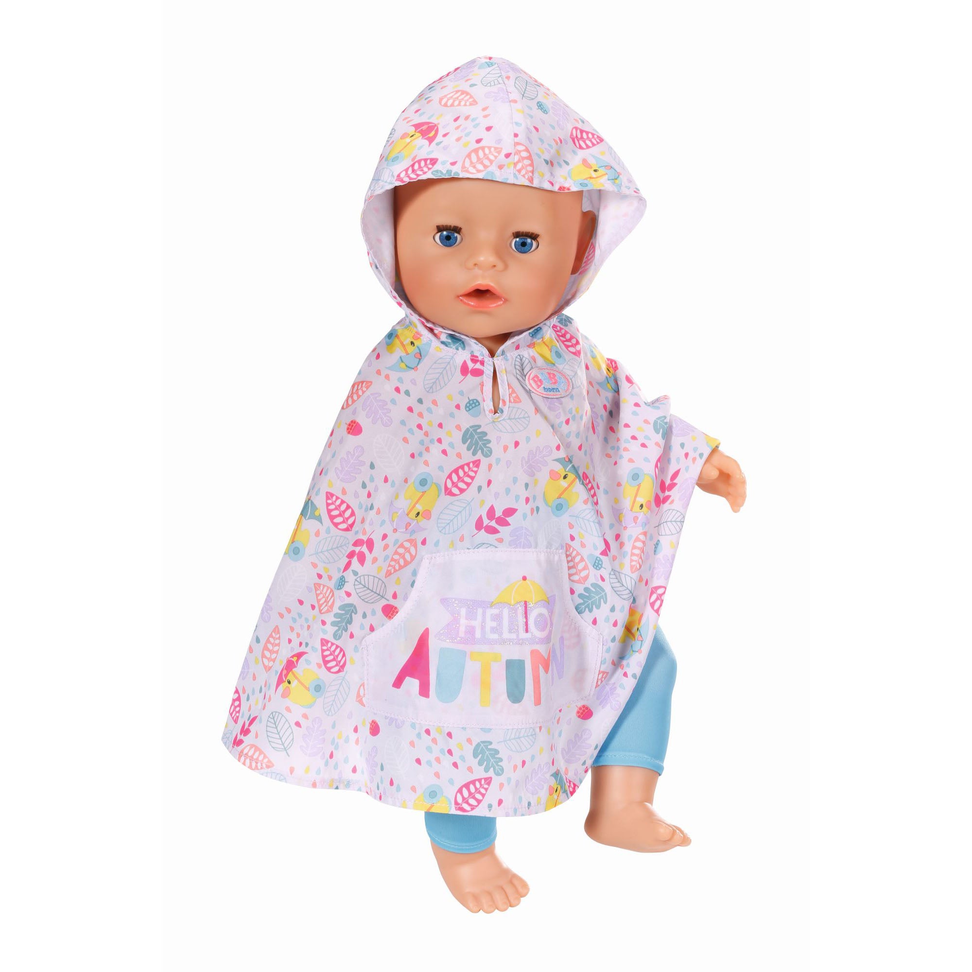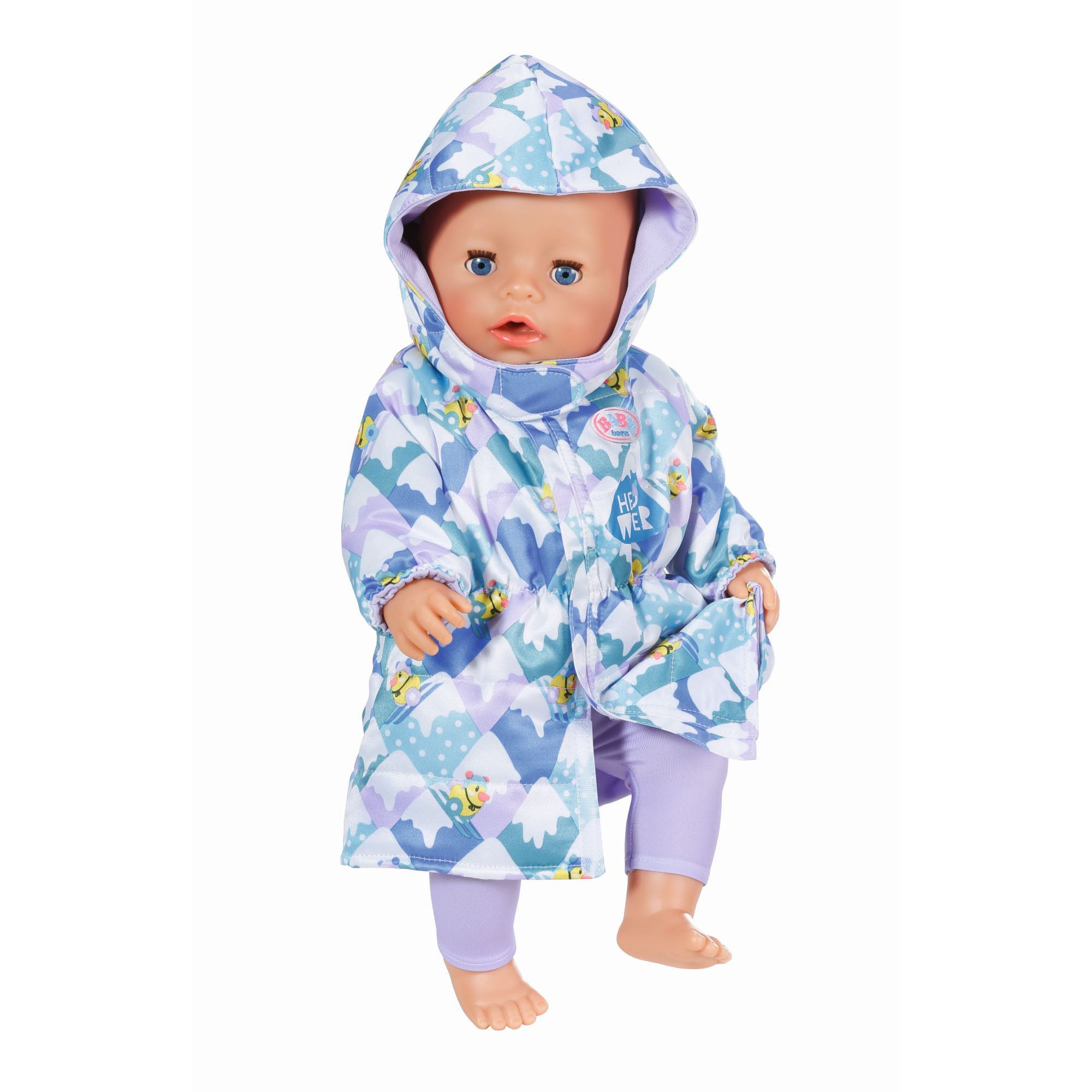 Vremea de toamna poate fi destul de schimbatoare. Dar micuta fashionista BABY born traieste dupa principiul ca nu exista vreme rea, ci doar haine neadecvate. Pelerina ei de ploaie este tinuta perfecta pentru toamna. Este decorata cu frunze colorate de toamna si are un imprimeu cu Ratusca Berta tinand o umbrela. Cand se raceste, BABY born isi scoate haina de iarna cu gluga din dulap. Pe haina, Ratusca Berta ii arata cum sa schieze.