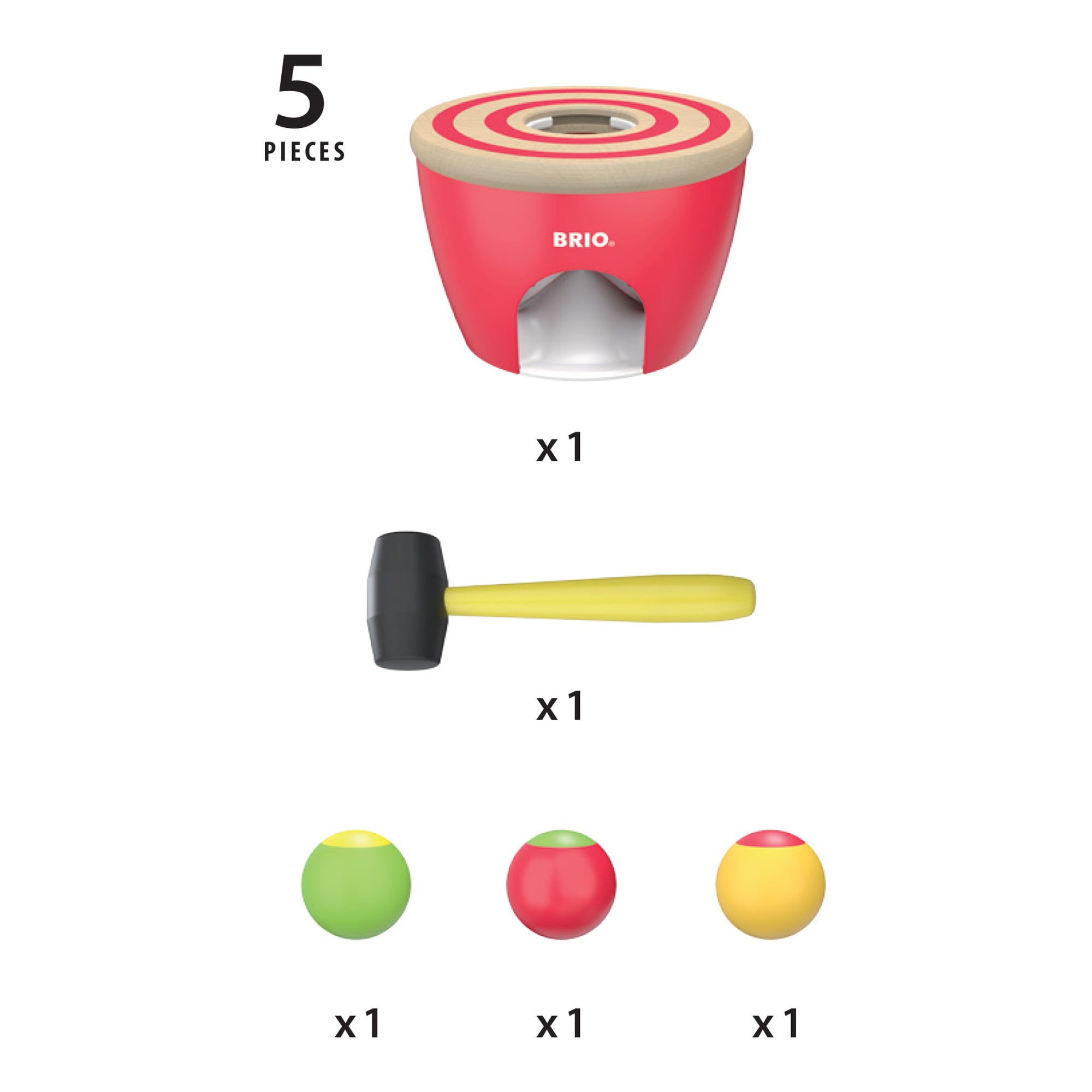 Lucruri care te fac sa sari de bucurie, banc cu ciocanel si bile de la BRIO! Pune bilele de diferite culori in galeata, asculta-le si urmareste-le cum se rotesc aleatoriu prin cele trei deschideri. Prinde-le! Apoi vom face totul din nou si din nou!