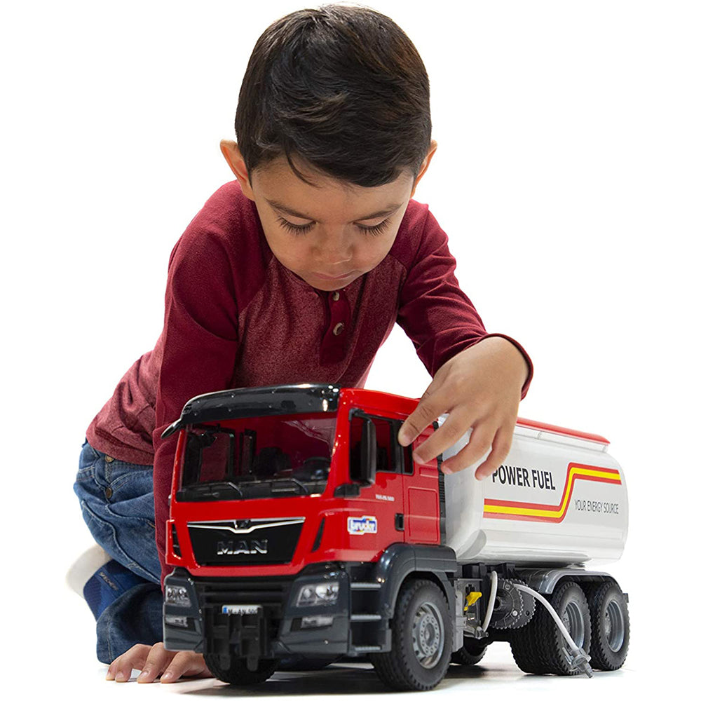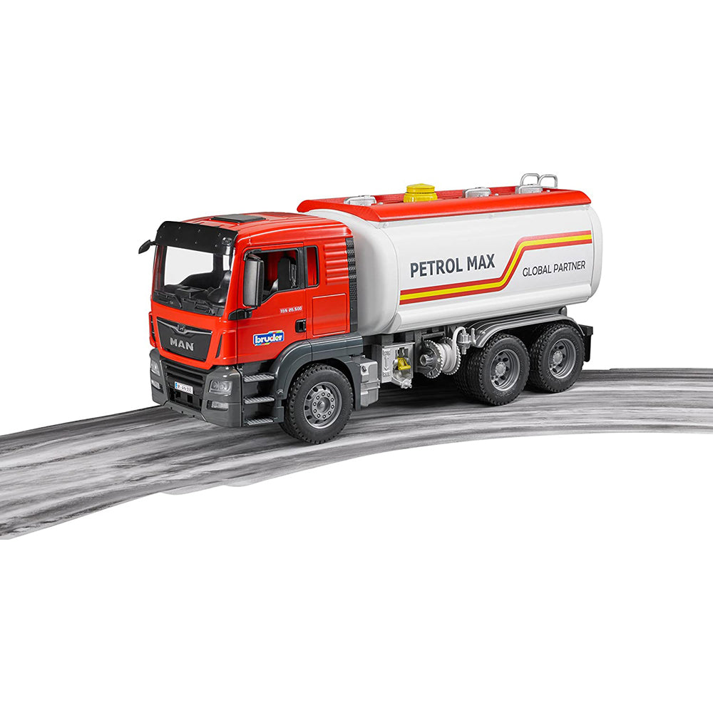 MAN TGS este vehiculul complet si perfect pentru santiere, transportul pe distante lungi si distributia locala. Datorita designului durabil, cu motoare puternice si cu o capacitate de lucru peste medie, acest camion are toate inovatiile la bord. Modelul de la BRUDER al cisternei MAN TGS la scara 1:16 este o combinatie intre noua cabina MAN si corpul cisternei refacut. Acest corp al cisternei complet functional aduce, de asemenea, o serie de functii noi pentru tinerii nostri soferi de cisterne. Umpleti rezervorul cu apa. Cresteti presiunea utilizand pompa manuala cu aer comprimat si actionati maneta de blocare pentru a scurge apa prin furtun folosind unitatea de scurgere.