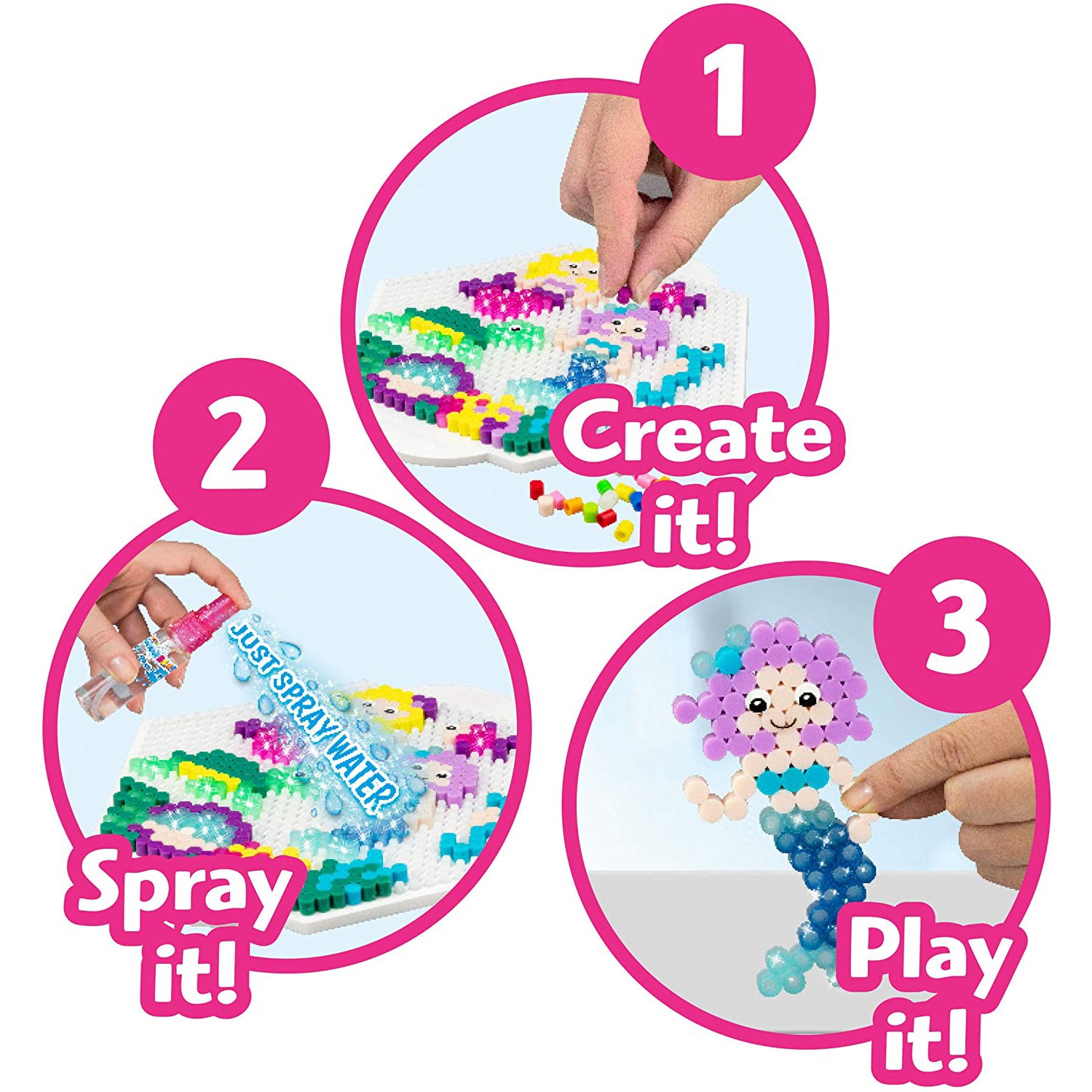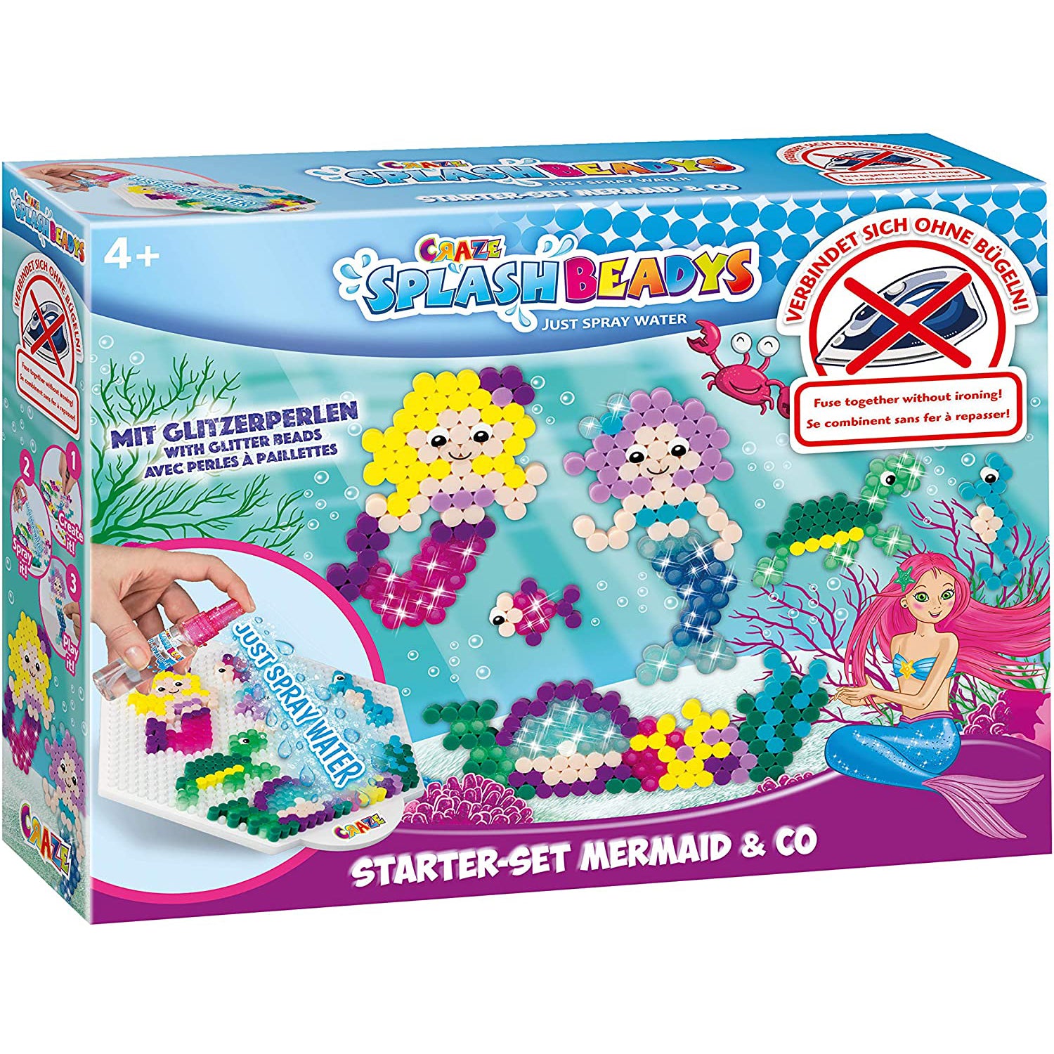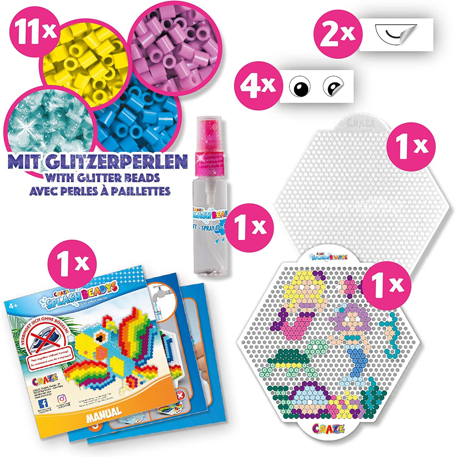 Setul contine, printre altele, 1 placa de creatie, 1 sablon de design, margele in 11 culori, precum si 1 spray de apa si 1 manual. Varsta recomandata 4 ani.