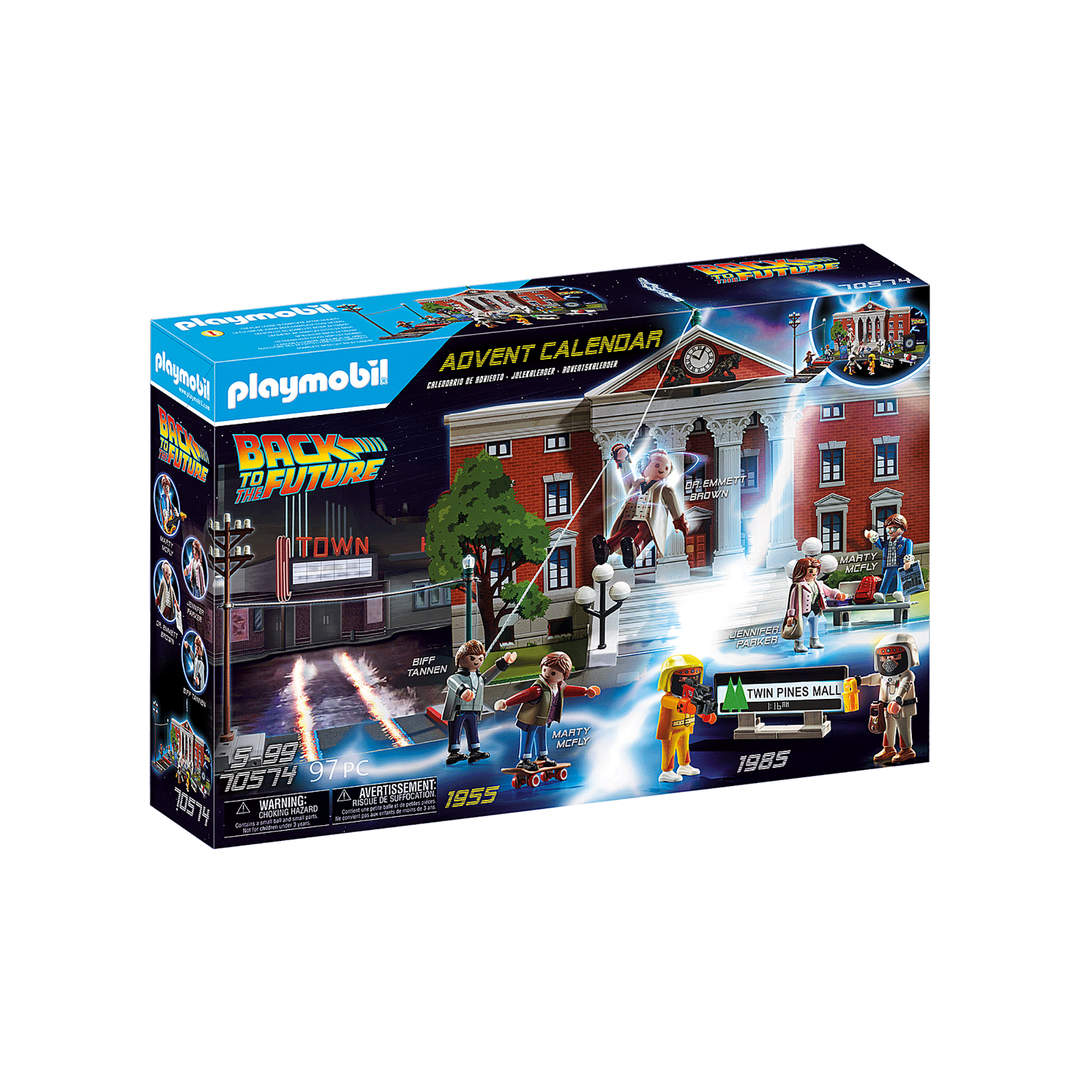 Incepeti numaratoarea inversa pentru Craciun cu un captivant Calendar PLAYMOBIL – Inapoi in viitorul! Odata ce toate surprizele au fost descoperite, cutia se deschide intr-un fundal pentru a completa scena iconica a pietei. Recreati scene iconice din Inapoi in viitor si Inapoi in viitor II! Inclusiv Marty McFly si Jennifer Parker discutand, si Doc Brown si Marty in parcul comercial Twin Pines Mall din 1985. Pentru fanii care doresc sa calatoreasca ceva mai inapoi in timp pana in anii 1950, Marty se poate intalni si scapa de Biff pe skateboard-ul sau . Este aproape ora 10:04, iar Doc Brown trebuie sa ajunga la turnul ceasului, sa valorifice fulgerul si sa-l canalizeze in condensatorul de flux! In plus, fiecare calendar vine cu o imagine cu efect lenticular. Urmariti cum familia McFly dispare in fata ochilor vostri!