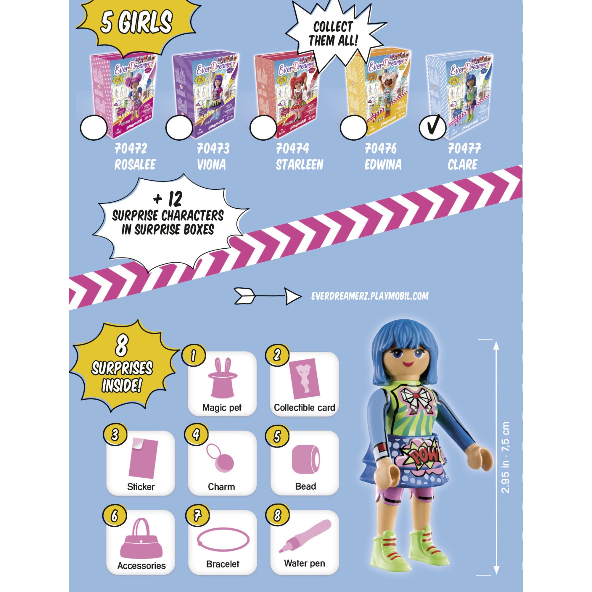 Ingenioasa Lumea Comica – Clare de la PLAYMOBIL, care este un geniu cand vine vorba de idei bune, se simte, de asemenea, ca acasa in lumea comica si colorata a benzilor desenate. Indiferent de orice obstacol sta in calea fetelor EverDreamerz , Clare are pregatita o solutie logica pentru fiecare situatie. Aceasta lume fantastica se invarte in jurul benzilor desenate, a artei si, mai ales, a culorilor stralucitoare. Fetele descopera cu entuziasm cum pot crea cu usurinta noi prieteni prin desen si pictura si sa-si lase creativitatea libera. Dar exista, de asemenea, multe provocari care se ascund in aceasta lume a viselor comice. Vor putea EverDreamerz sa impiedice visul colorat al lui Edwina sa se transforme intr-un cosmar alb-negru?