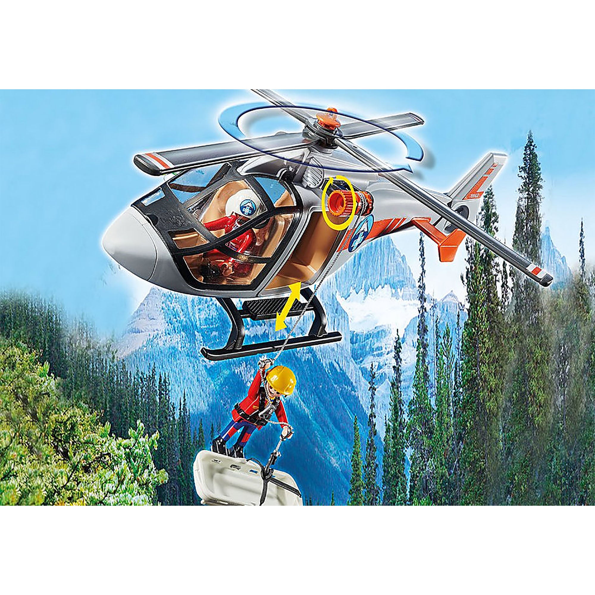 Este timpul pentru noua OPERATIUNE DE SALVARE DIN CANION de la PLAYMOBIL. Oh nu! Se pare ca cineva a cazut prin pod si are piciorul ranit. E blocat si in apropiere este un urs. Are nevoie de ajutor rapid! Urmariti cum elicopterul, cu pale rotative, zboara peste canion pentru a localiza persoana ranita de sus. Odata gasit, salvatorul coboara din elicopter cu o targa. Folosind trusa sa de prim ajutor, il ajuta pe ranit inainte de al incarca in targa si de a-l transporta in siguranta.